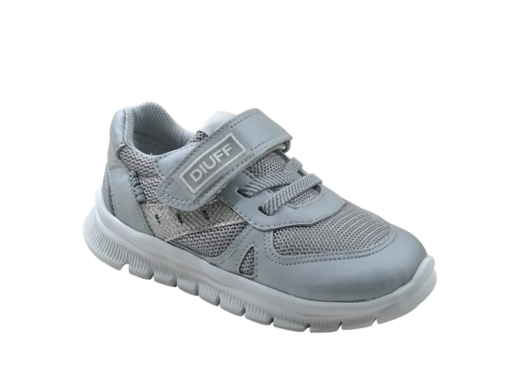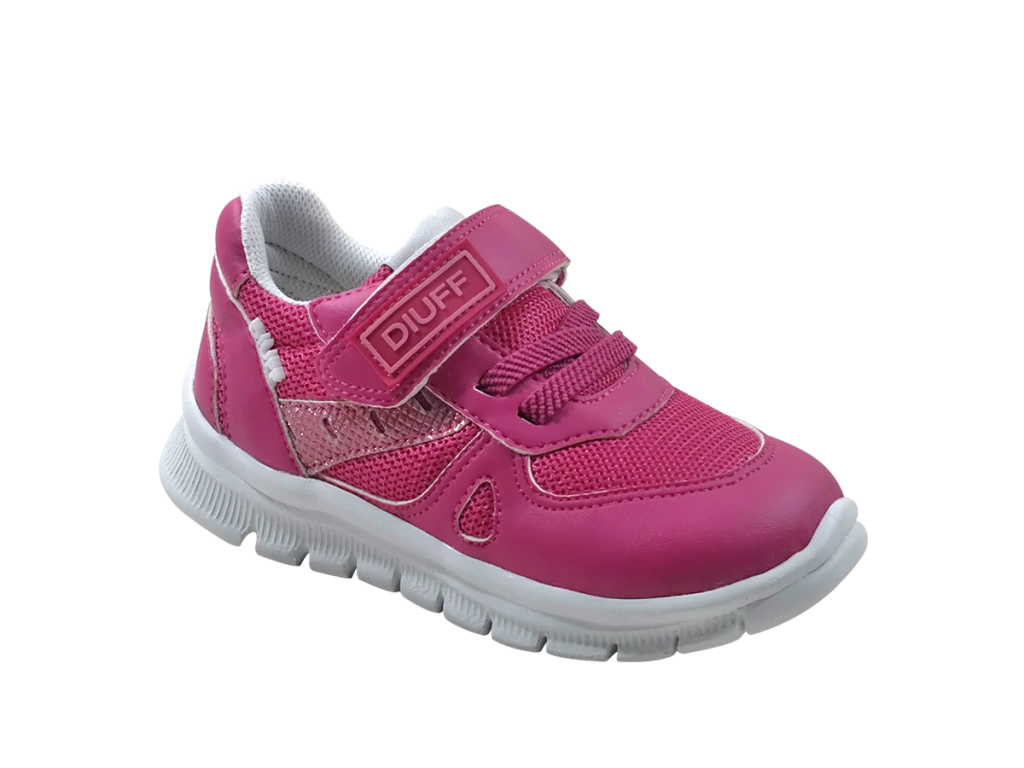 Zapatilla Diuff realizada con doble frontura y sintético. Con ajuste de tira de velcro y cordones elastizados. Tela piqué en su interior y suela en material EVA. Fucsia y Gris con glitter.